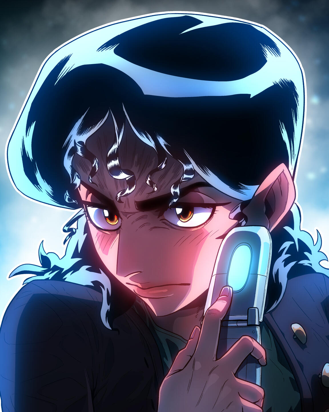 A shot of the character starting from the shoulders up.